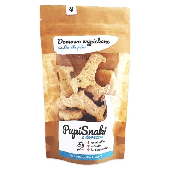 PUPIsnaki to domowo wypiekane ciasteczka dla psów z polędwicą z dorsza, stworzone z myślą o zdrowiu Twojego pupila. Pysznie chrupiące, naturalne, bez sztucznych ulepszaczy i konserwantów - to zdrowa, smaczna przekąska, która wspiera trawienie i dba o świeży oddech Twojego psa.