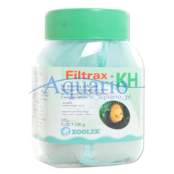 Filtrax to seria wkładów filtracyjnych firmy Zoolek pozwalających w prosty i skuteczny sposób unormować parametry i jakość wody w akwarium. Filtrax KH to wkład przeznaczony do obniżania twardości węglanowej. Jest to mozliwe dzięki obecności jonów wapnia, które ulegają wymianie na kationy wapnia i magnezu. Dodatkowym skutkiem będzie również nieznaczne obniżenie sie poziomu pH.